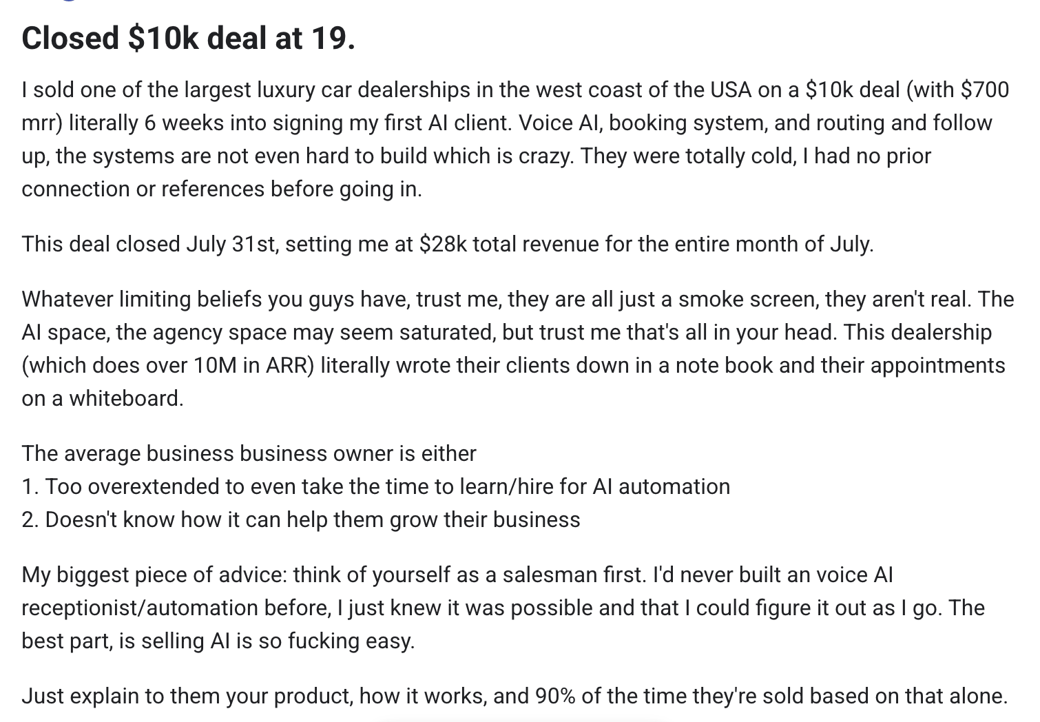 Someone in my automations community just closed a $10k deal and he’s only 19 years old.
